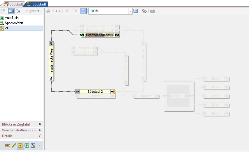 Umsetzgleise werden durch die Zuweisung von Blöcken und Weichenstraßen erstellt. Diese Zuweisung erfolgt ähnlich wie die Zuweisung von Blöcken und Weichenstraßen zu Zugfahrten.