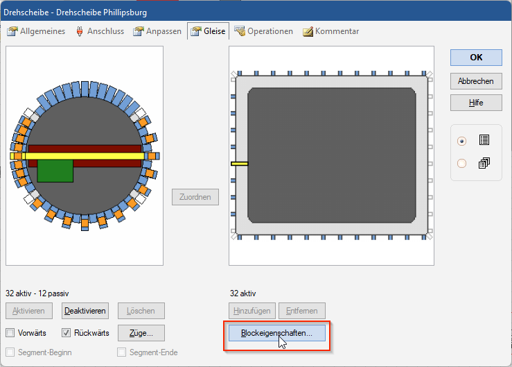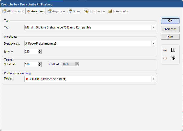 Unsere Einstellungen im TrainController Gold für Drehscheibe, Schiebebühne und Segmentdrehscheibe